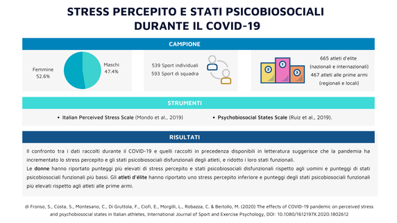 In particolar modo, nei nostri tre studi, abbiamo analizzato in che modo la pandemia ha influenzato il costrutto di identità degli atleti e la loro regolazione emotiva (Costa et al., 2020); abbiamo poi approfondito il ruolo dello stress percepito degli atleti nella gestione della crisi pandemica (di Fronso et al., 2020); infine, nel terzo studio ci siamo soffermati sullo stress percepito da parte degli allenatori e sulla loro capacità di regolare le emozioni in questa situazione di forte crisi (Santi et al., 2021). E' invece in corso di stesura l'articolo sulla differenza negli obiettivi tra atleti e allenatori, pre e post lockdown.